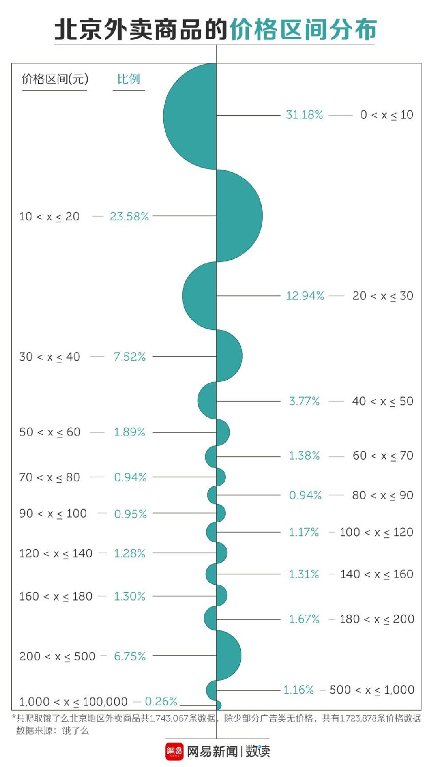 这样看来,近七成的外卖商品价格在30元以下,近八成的外卖商品价格在50元以下。从数据上来看,50元以上各价格区间的外卖商品所占比例较小。