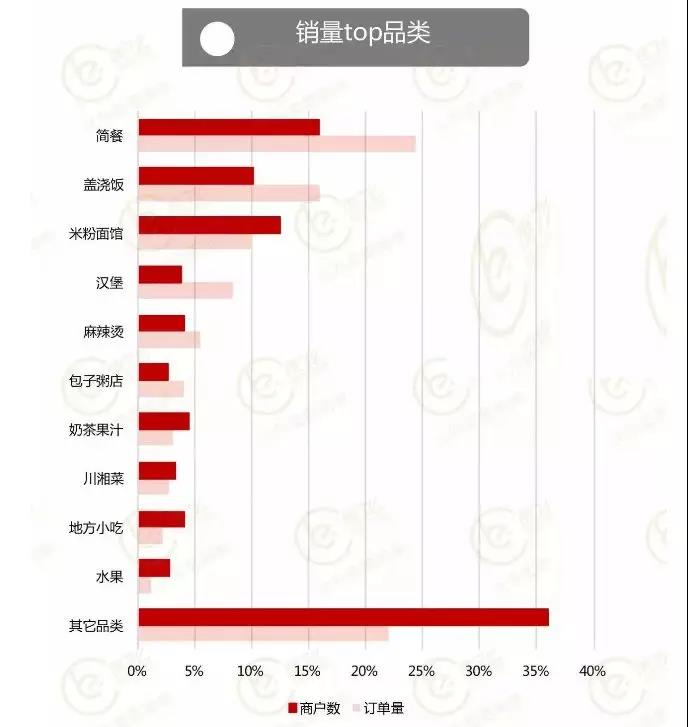 以快餐为代表的,满足功能性需求的品类仍然是热门。与此同时,满足多元化、个性化、品质感的需求也不容忽视。饿了么商家学院公布的数据显示,2017 年订单量前三甲的品类为简餐、盖浇饭、米粉面馆。占比分别为 24%、16% 和 10%。排名前十位的其它品类如包子粥店、奶茶果汁、川湘菜、地方小吃,单项占比虽不足 5%,总和起来却不小。