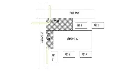 在典型的聚客中心的四周,会有持续不断的人流,只要中间没有阻隔因素,四周的店铺门前的流量都会有保证。不过,如果中间被马路隔开,那么店铺门前的流量就会明显下降。比如下图中,4个店铺都紧邻聚客中心,但店1和聚客中心之间有一条道路阻隔,它的获客能力就会明显低于其它3个店铺。这样的铺位尽量避免选择