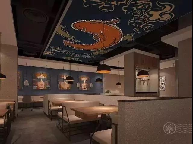 在空间体验上,餐厅的配色很是讨巧,蓝色和暖黄色相互搭配,显得很有朝气和活力。墙壁上的师徒头像深入人心,顶棚的大鱼形象也栩栩如生,活脱脱是一出师徒探索酸菜鱼奥秘的故事!