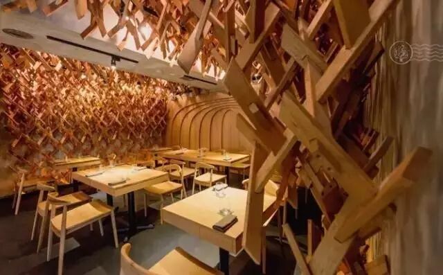 空间最大的特色就是对木材料的使用,室内是由2000多根的木条采取对角编制方式制作而成的,在没有用到铁钉的前提下,创造出拼接的空间,颇有咖啡色泽的美感。