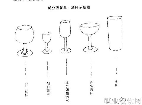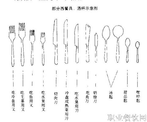 西餐具的摆设与中餐不同。西餐具有刀、叉、匙、盘、杯等。刀分食用刀、鱼刀、肉刀(刀口有锯齿,用以切牛排、猪排)、奶油刀、水果刀;叉分食用叉、鱼叉、龙虾叉;匙有汤匙、茶匙等;杯的种类更多,茶杯、咖啡杯均为瓷器,并配小碟,水杯、酒杯多为玻璃制品,不同的酒使用的酒杯规格亦不相同。宴会上几道酒,就配有几种酒杯。公用刀叉规格一般大于食用刀叉。