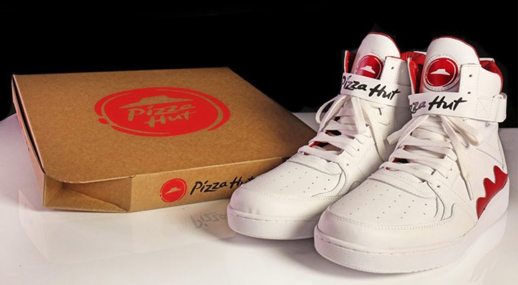 去年 3 月,全球“比萨专业户”之一的必胜客推出了他们的第一款跨界合作球鞋 Pie Tops。虽然 Pie Tops 的外观看起来和市面上大部分的普通球鞋没多大区别,但通过与智能手机进行蓝牙配对后,用户每次只需点按鞋舌上的按钮,就能一键下单点外卖。这可谓是披萨爱好者和懒人的一大良品。