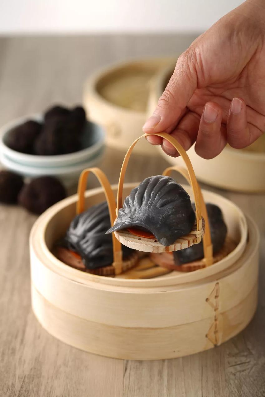 黑松露是世界三大珍味之一,被誉为“餐桌上的黑钻石”,物稀价高。这款耗时半年开发出的点心将黑松露恰到好处地融到虾饺中,香气浓郁,口感特别,包裹馅料的手擀皮仅1毫米厚,保证了虾饺入口后兼具弹性和韧性。同时,黑松露虾饺整个制作流程完全采取量化和标准化操作,保证每个虾饺规格高度统一,55克、18个褶子。