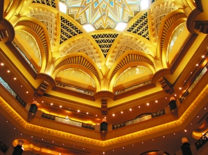 央视消息阿联酋阿布扎比有一座用40吨黄金打造而成的八星酒店,这座用价值30亿美金堆出来的皇宫式酒店,其奢侈程度,大概是除了富得流油的阿拉伯人以 外的人都难以想象的。酒店建筑群的穹顶全部由马赛克砌成,其中最大的穹顶直径达42米,表面镀银,并在顶端装饰了黄金。入住房客在酒店100公顷区域内的 任何一处,都可以享受到无线上网的乐趣。
