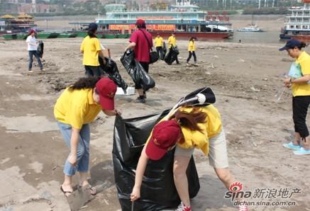 图为酒店员工在朝天门码头捡垃圾中