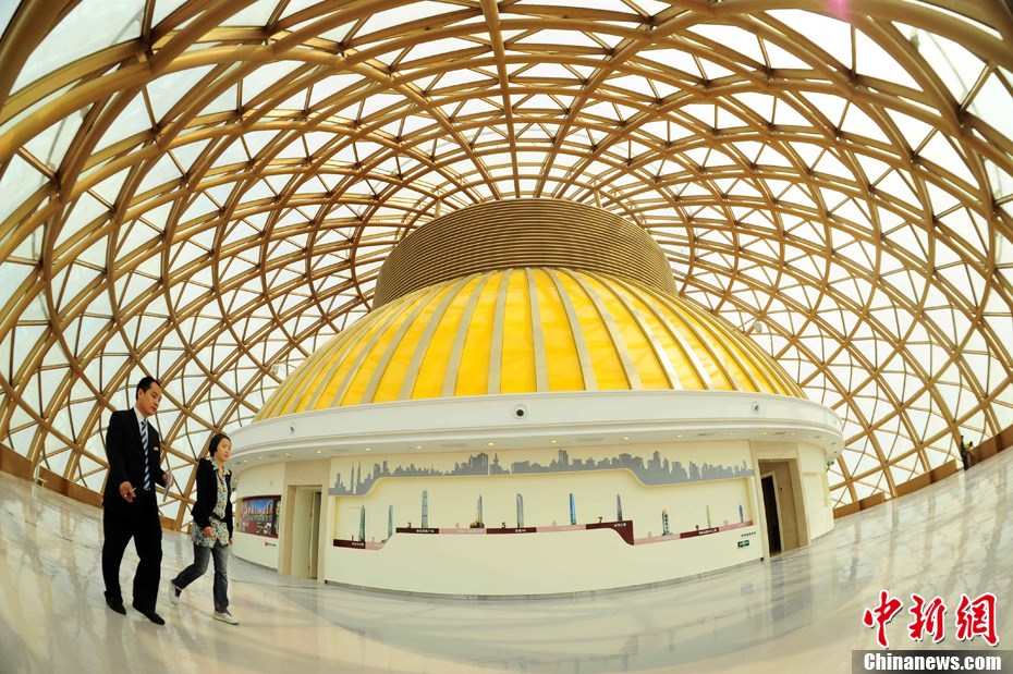 10月8日,筹资30亿元人民币建起高328米的“黄金酒店”——龙希国际大酒店在江苏省华西村剪彩开业。该酒店是中国国内最大的单体酒店之一,也是华西村为迎接和庆祝华西五十年村庆的一大献礼。酒店开业后更显奢华,顶部的61层有空中花鸟园、空中游泳池;酒店二楼则设有2000平方米的购物区。图为酒店328米处穹顶。中新社发 杨可佳 摄