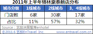 目前,经济型酒店数量在北京、上海等一线城市面临结构性饱和,门店布局向二三线城市过渡是行业大势所趋。格林豪泰酒店2011年上半年新开门店中,仅11%位于一线城市,而二线城市占比达57%,3、4线城市达到32%。如家酒店也表示今年新开门店中45%-50%将选址在三四线城市。