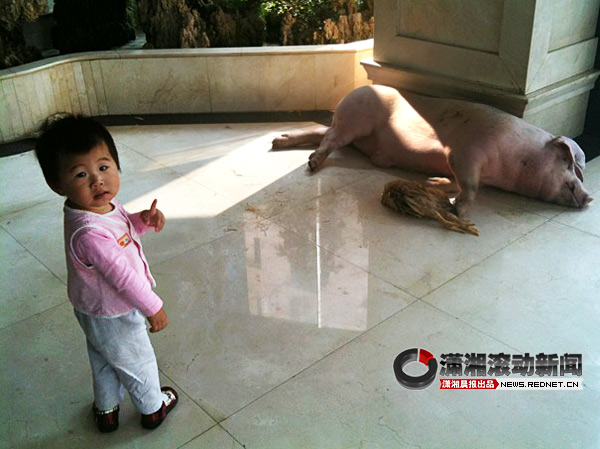 (潇湘晨报滚动新闻记者 范思鼎 吴静)昨日上午,芙蓉中路上车水马龙繁华如昔,小林子冲附近的长信大酒店却来了一群不速之客:一头一米多长的猪正酣睡在酒店大堂门口,它的身边是一只两腿伸直的鸡,而在地板发亮的大厅内,9只白色的鸭子、9只鸡正成群地闲逛。