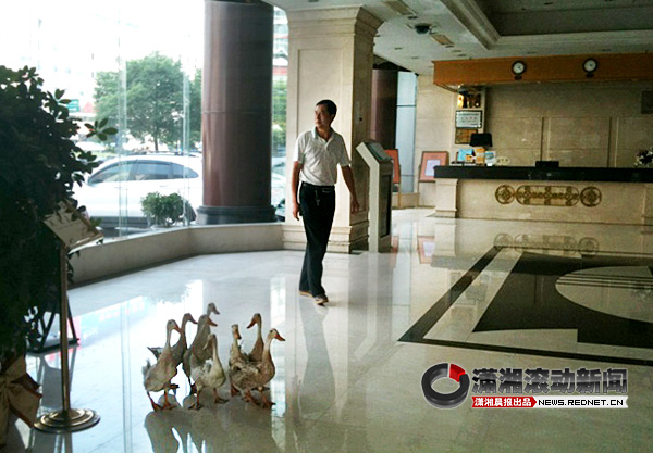 (9月27日,长沙芙蓉路长信大酒店,一群鸭在大厅晃荡,它们是来陪主人讨债的。图/潇湘晨报滚动新闻记者吴静 范思鼎)