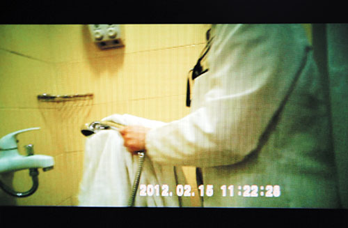 工作人员用浴巾擦拭喷头