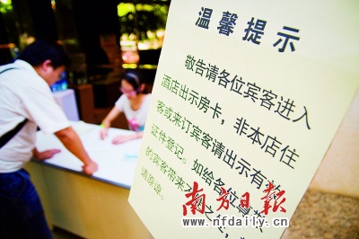 记者了解 到,由7月份开始至亚运期间,凡是入住 酒店的 旅客和来访客人,在开房取钥匙前必须以一人一证的方式实名登记,属于个人有效证件的包括:身份证、驾驶证和户口簿。未携带有效身份证件的 旅客,应到旅馆业单位所在地辖区派出所开具相关身份证明。对拒绝住宿登记的 旅客及来访人员,旅店应当拒绝其入住或进入。
