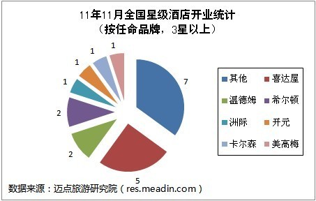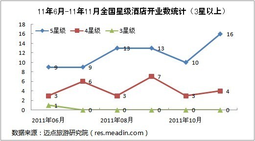 据迈点旅游研究院对国内酒店开业情况的不完全统计,2011年11月,国内开业的星级酒店数为20家,客房总数约5668间(套)。与上月相比,本月新开业星级酒店总数增加了7家,增幅为54%;而客房总数与上月相比增加约1520间(套),增幅达37%。